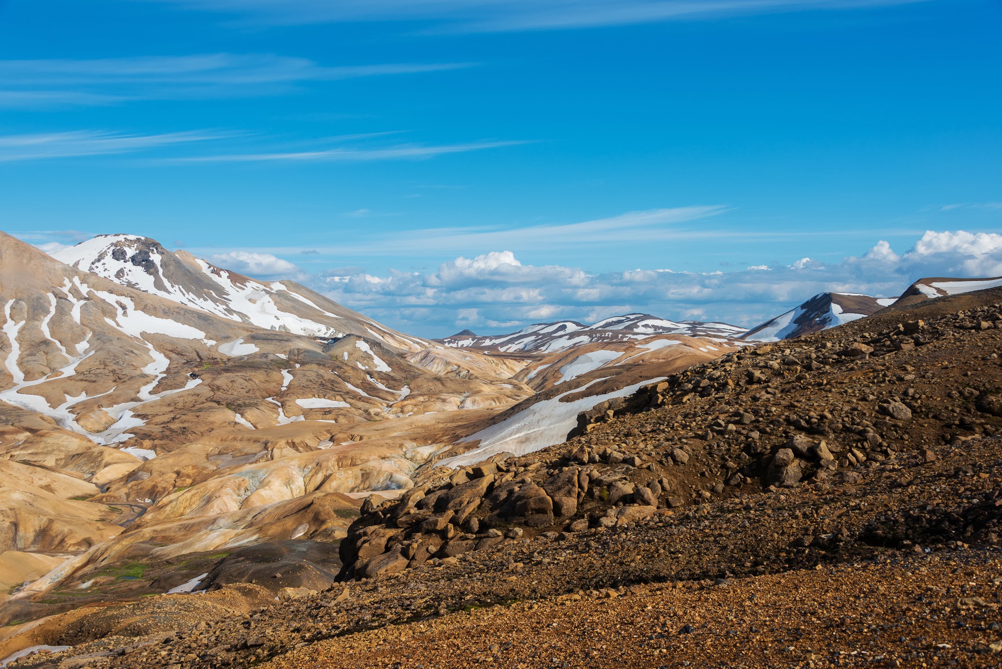 Zum Geothermalgebiet Hveravellir wars nur ein Katzensprung, die Piste war allerdings recht holprig und teilweise ärgerlich schwer zu fahren. An der Wegkreuzung von Kerlingarfjöll mit der Kjölurpiste stand ein VW Bus mit dem Kennzeichen MB wie Miesbach (tags zuvor hatte ich bereits mit einer Frau mit Rosenheimer Kennzeichen gequatscht), die gerade überlegten, ob sie nach Kerlingarfjöll fahren sollten. Ich blieb stehen, wir unterhielten uns, im Fluss der Unterhaltung über Island, Erlebnisse und Sehenswertes wanderten eine Banane und Schokolade in meinen Magen ohne gross den Redefluss zu unterbrechen, und einige Minuten später hielt ein Mietwagen an und zwei Rosenheimer gaben sich zu erkennen, ein südostoberbayerisches Gipfeltreffen im isländischen Hochland...